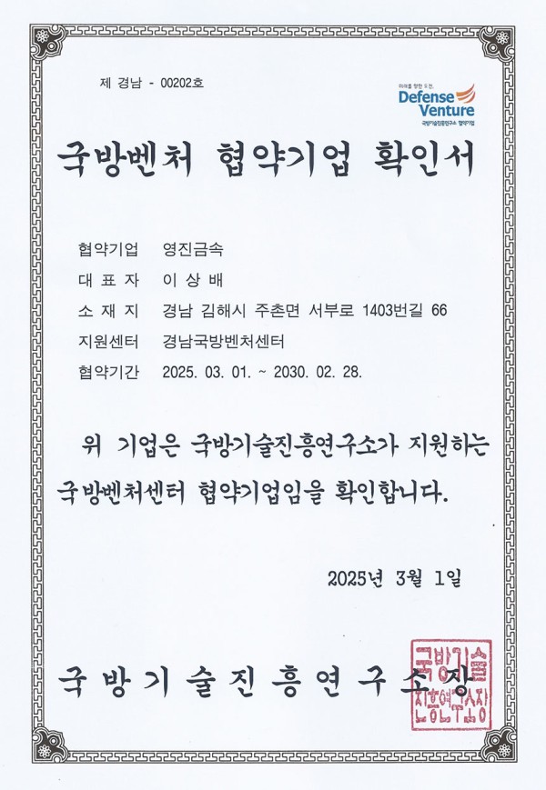영진금속 주소 경상남도 김해시 주촌면 서부로 1403번길 66 대표자 이상배 l 사업자번호 603-02-71439 l 전화번호 055-328-2127 l 팩스 055-328-2827 E-mail youngjin9226@naver.com